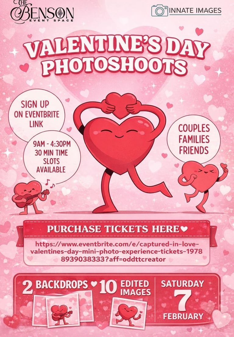 Love is in the air at Benson Event Space! Join us on Saturday, February 7, for our Valentine’s Day Photoshoots. Whether you're celebrating with a partner, your family, or your best friends, we have the perfect backdrop for your memories.